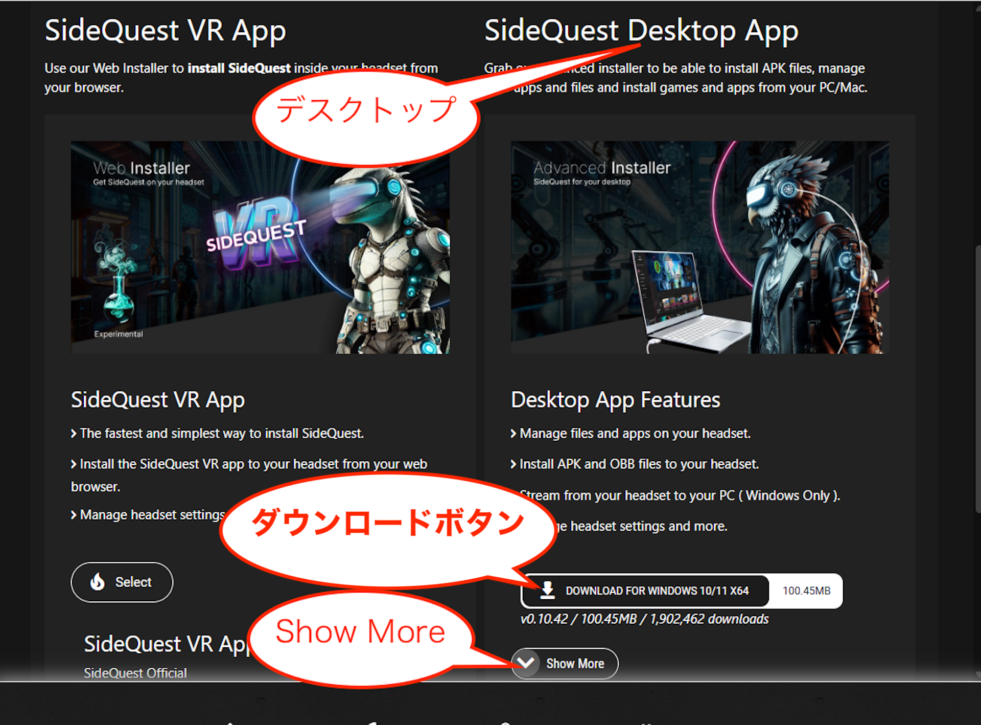 SideQuestのウェブページの中段ほどに、SideQuestデスクトップアプリのダウンロードボタンがあります。ここから、ご利用のパソコンに合わせたアプリをダウンロード・インストールしてください。表示されているOS以外のアプリは、「Showt More」というボタンで表示させます。