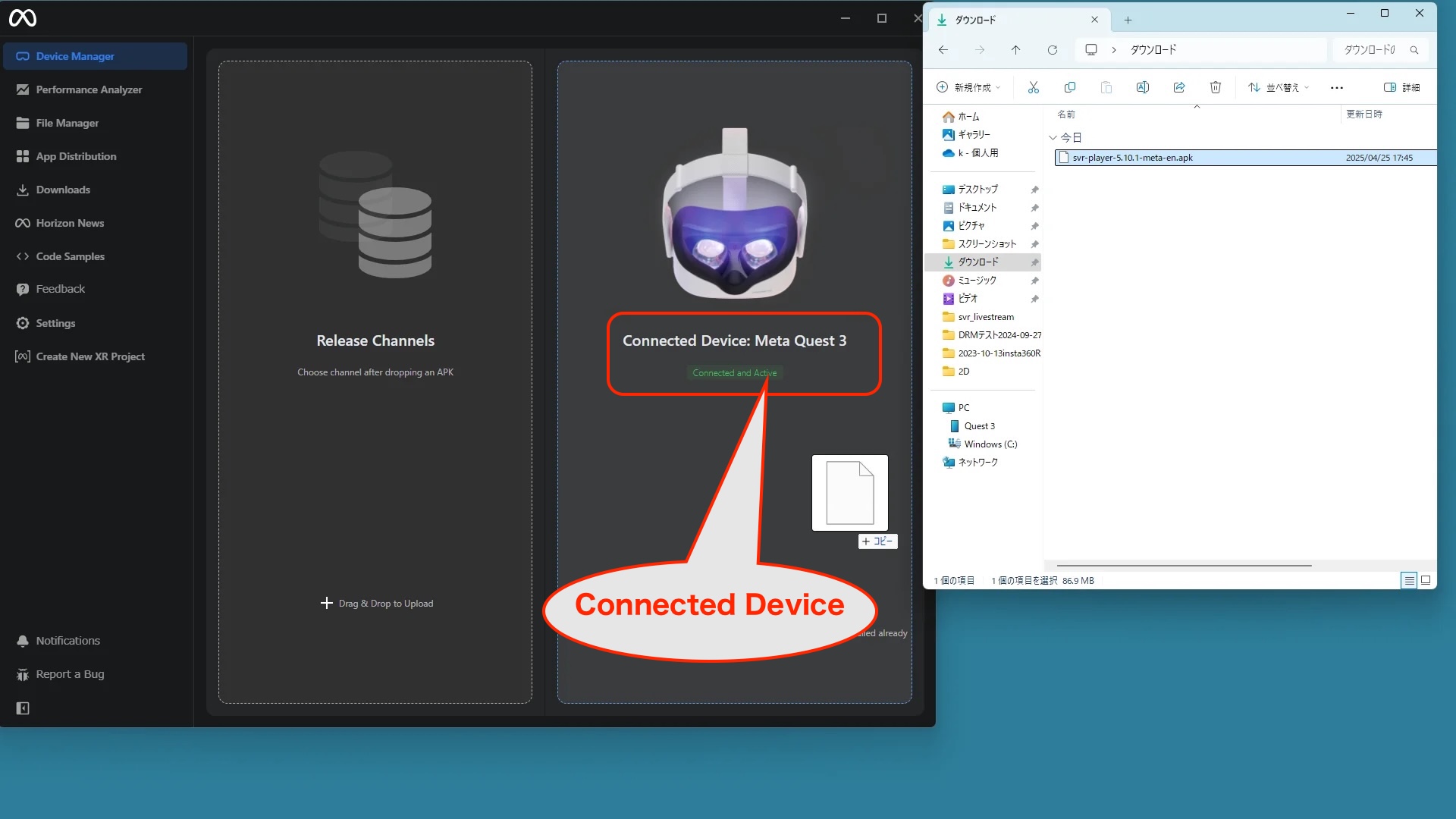 apkファイルのインストール機能もその一つで、MQDHを使うメリットは、Side Questと違ってインターネットへの接続が無くてもapkファイルをMeta Questにインストールすることができることです。。