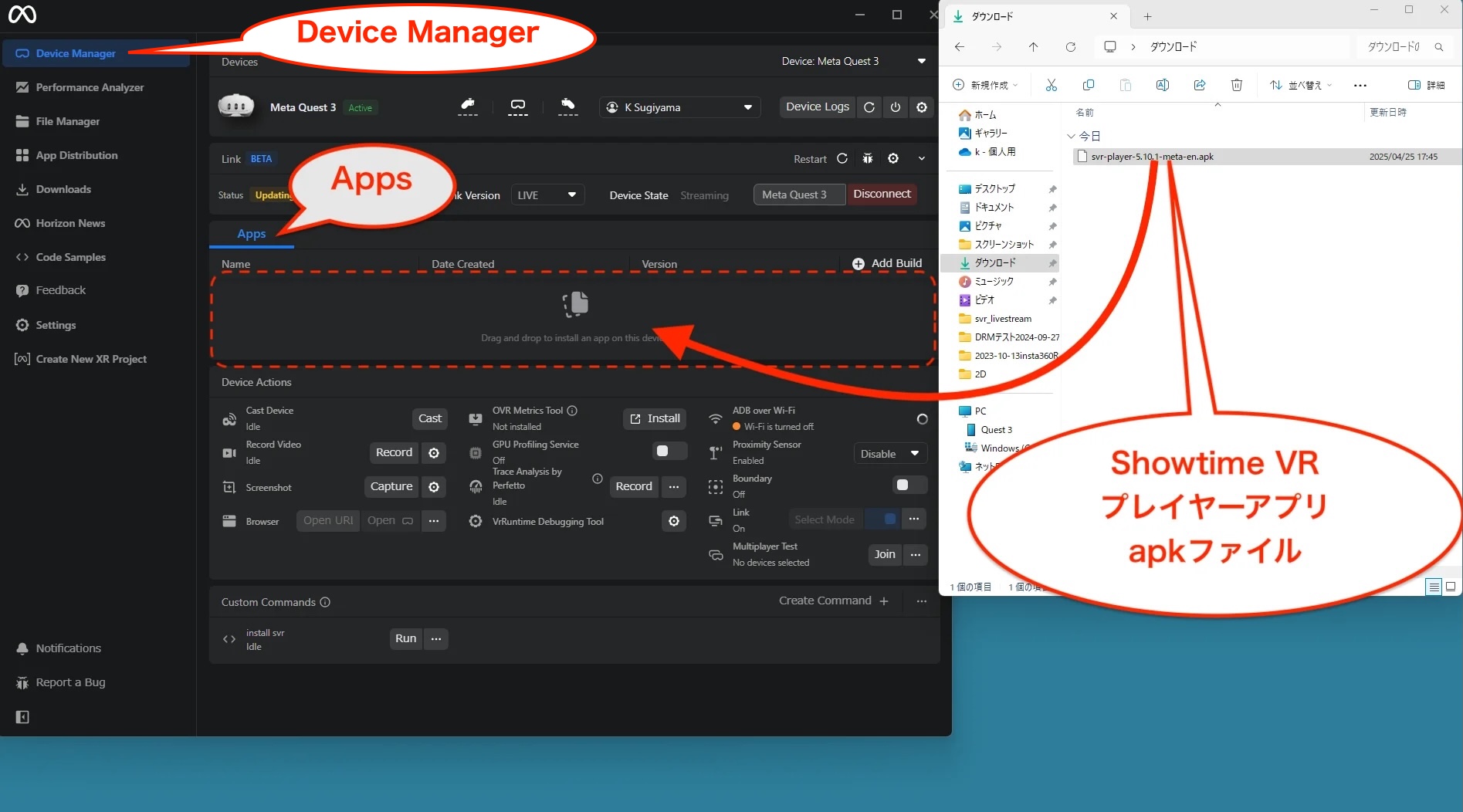 MQDHの「Device Manager」タブを開き、Showtime VRのプレイヤーアプリのapkファイルを、Appsという箇所にドラッグ&ドロップするだけです。