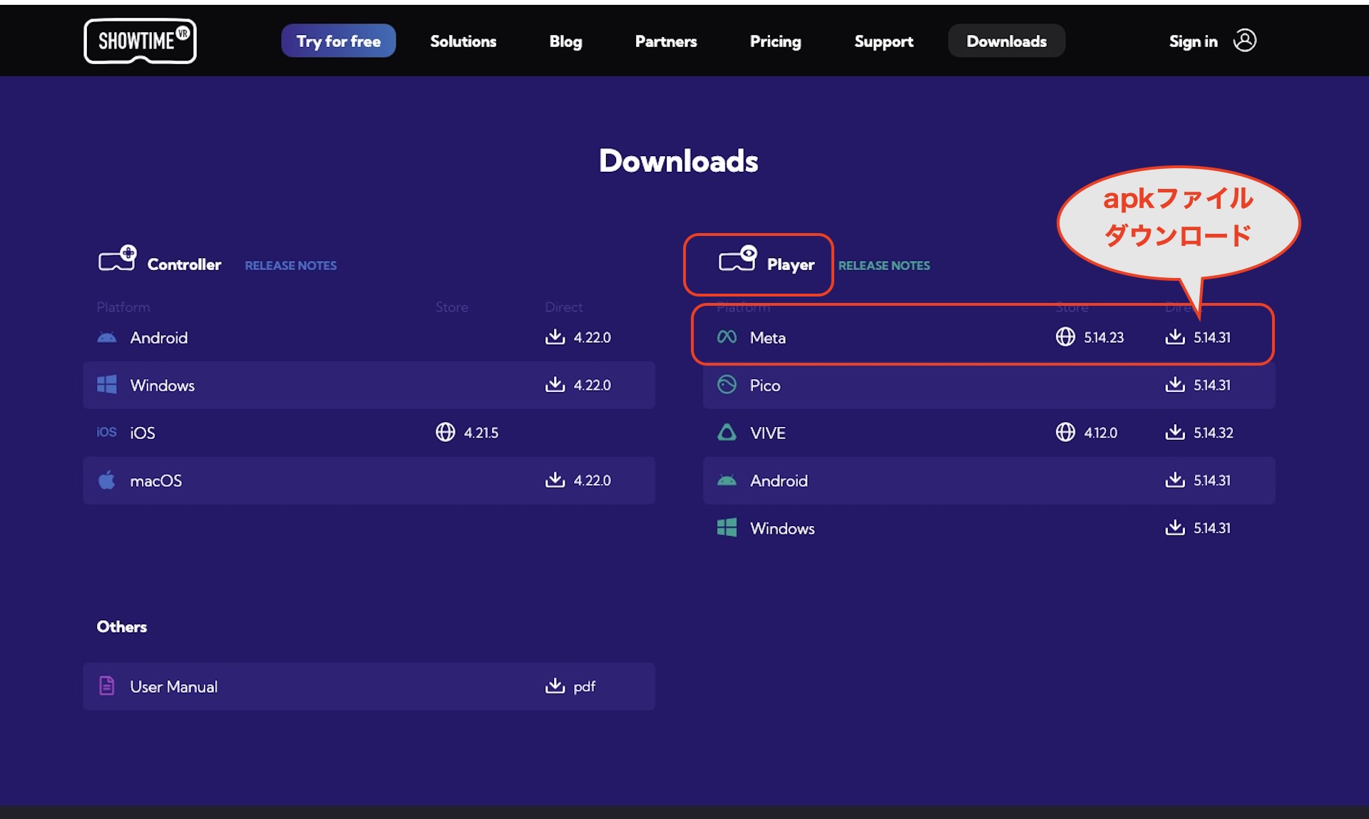 そこで、Quest 用のプレイヤーアプリのAPKファイル(Android専用ソフトウェアのファイル)をお使いのパソコンにダウンロードします。Showtime VRアプリのダウンロードページで、「Player」カテゴリ内、「Meta」と分類されているダウンロードアイコンです。