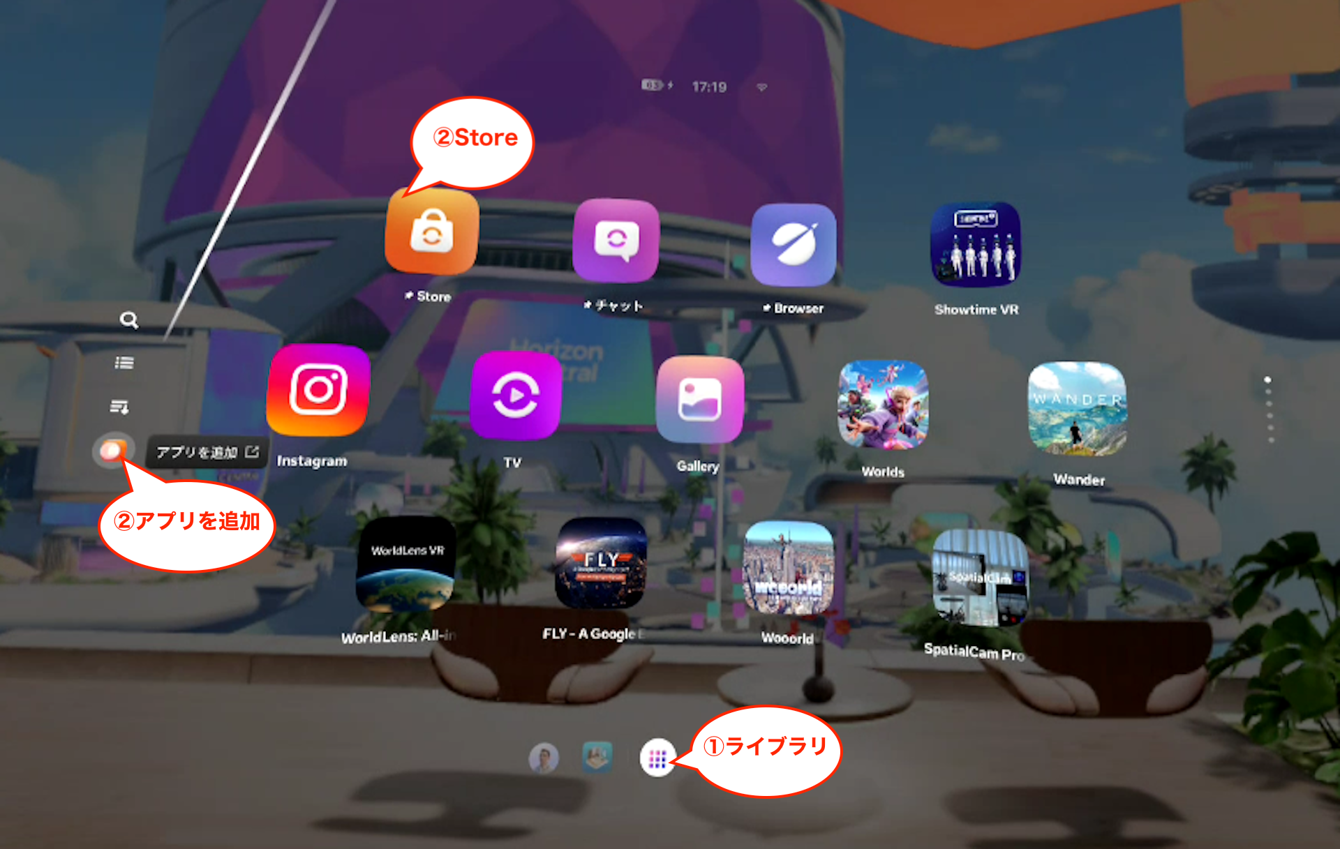 Meta Questの①ライブラリ画面で、②「Store」または「アプリを追加」アイコンをクリックしてください。