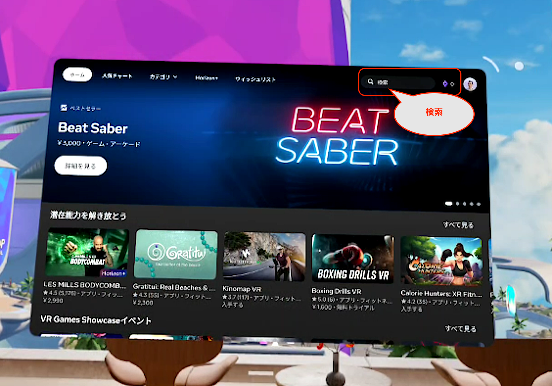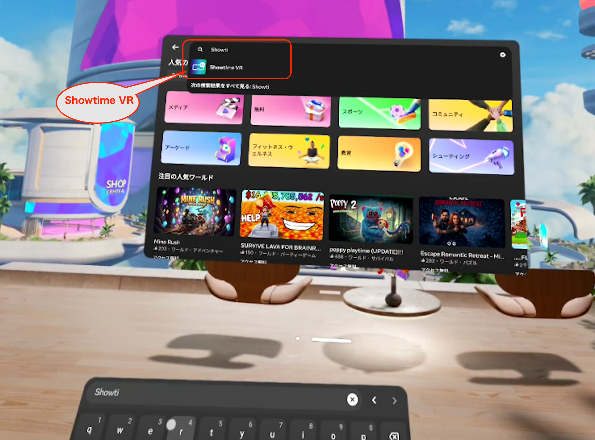 Meta ストアとは、Metaの公式アプリ配信システムです。Meta Quest VRヘッドセットだけで、直接Showtime VRのプレイヤーアプリをインストールすることができます。