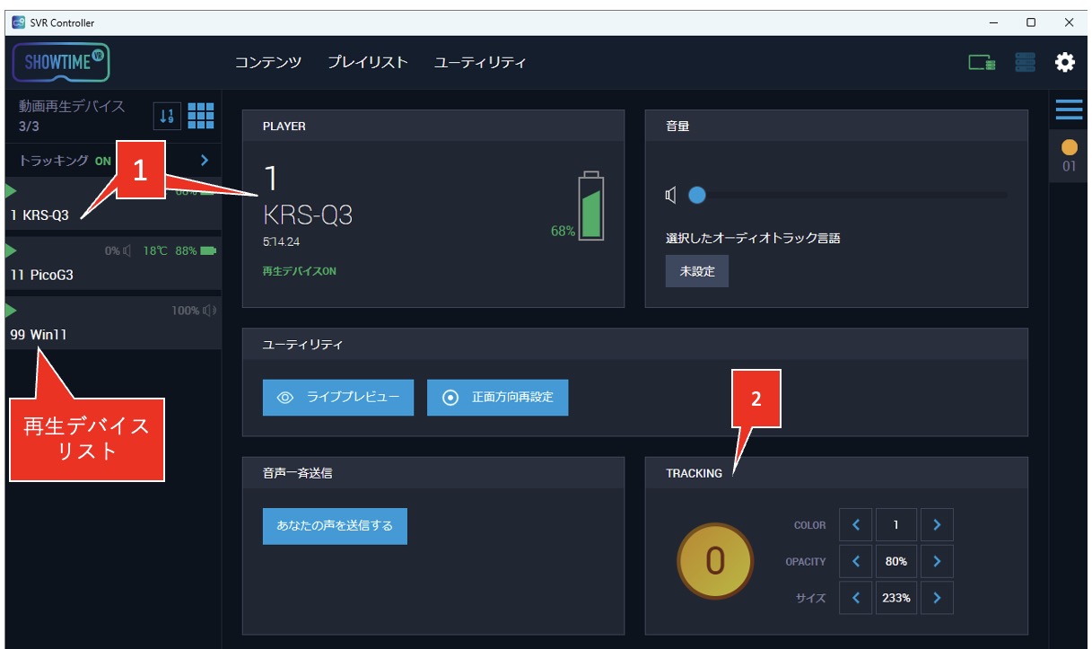 Showtime VRのコントローラーアプリでは、左側に接続されている再生デバイス(VRヘッドセットやパソコンなど)が位置列に表示されます。そのどれかをクリックすると(下の例では (1)KRA-Q3)、その再生デバイスの設定や再生状況表示画面が表示されます。